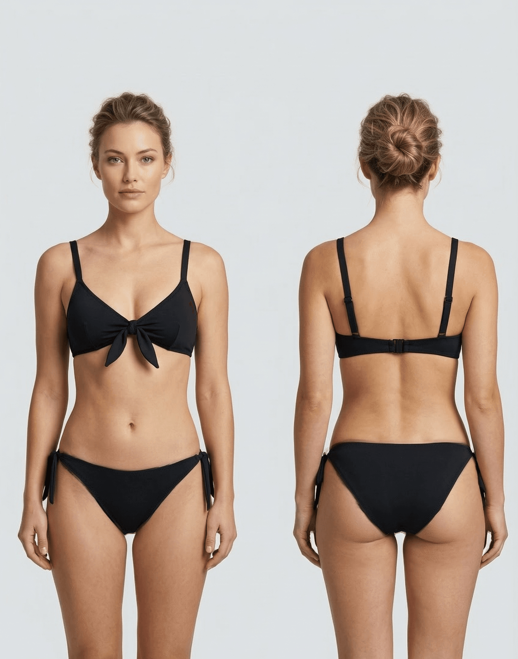 O modelo possui três variações de laço, que podem ser aplicadas tanto na parte frontal do top quanto nas laterais das calcinhas, permitindo diferentes propostas estéticas e de amarração.